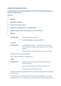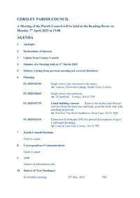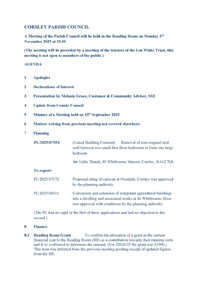 Everyone is welcome to attend but there are protocols for the public to speak at the meetings. Interruptions of PC discussions by the public are not allowed. If you would like to speak on a subject at one of the meetings, please email the Clerk, John Willcox (corsleypc_jdw@aol.com), who will add it to the agenda. These opportunities to speak will be arranged at the beginning of each meeting and speakers will be allotted a set amount of time.